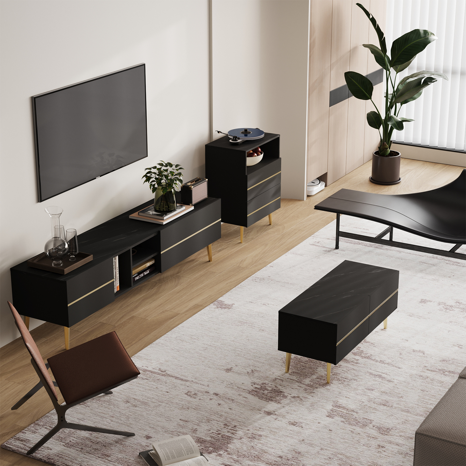 - أرجل ذهبية موحدة: ترفع الأرجل المعدنية الذهبية جميع قطع الطقم بارتفاع مثالي، مما يسهل وصول المكانس الكهربائية والروبوتات للتنظيف أسفلها، ويعزز من شعور الاتساع في الغرفة.