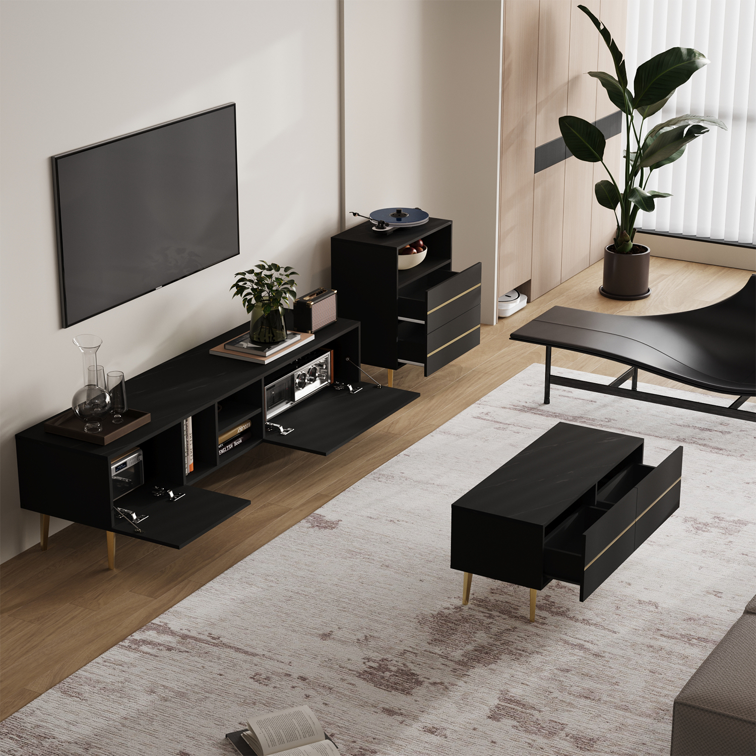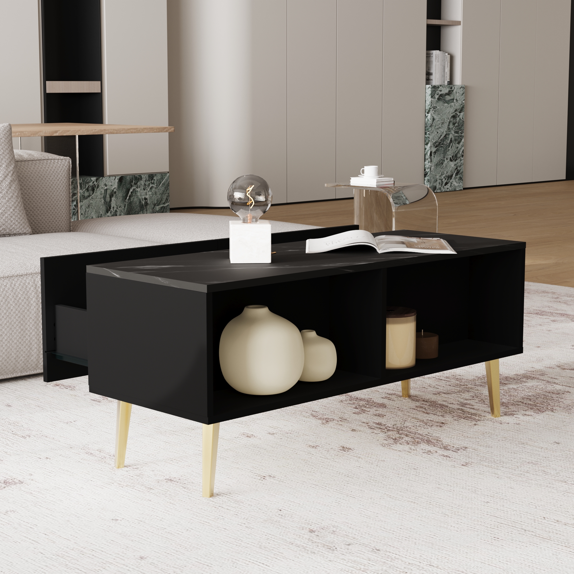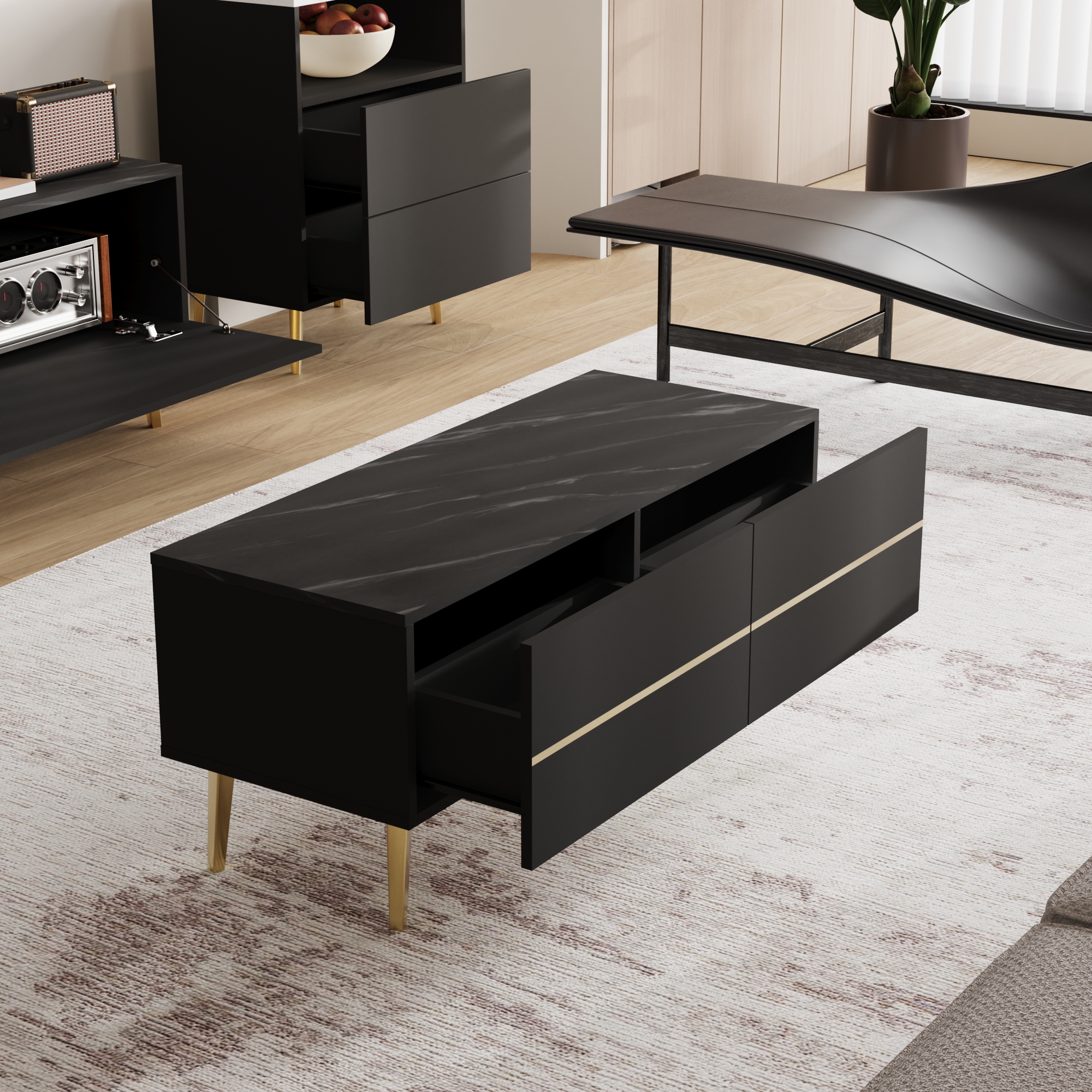 - أسطح بألوان رخامية فخمة: تتميز الطاولات بأسطح ذات نمط رخامي أسود فاخر يضيف عمقاً جمالياً للقطع ويسهل تنظيفها ومقاومتها للاستخدام.