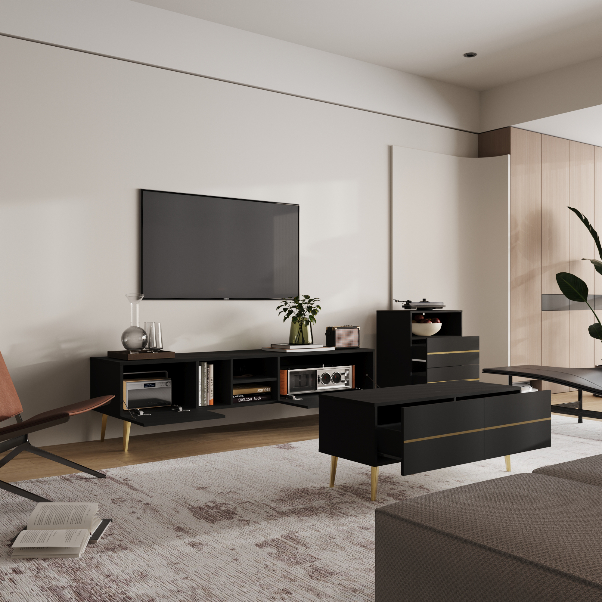 - تعدد الحلول التخزينية: يجمع الطقم بين التخزين المفتوح للعرض (التحف والكتب) والتخزين المغلق (الأدراج والأبواب) للحفاظ على الخصوصية وإخفاء الأسلاك والأغراض الصغيرة، مما يضمن بقاء الغرفة مرتبة دائماً.