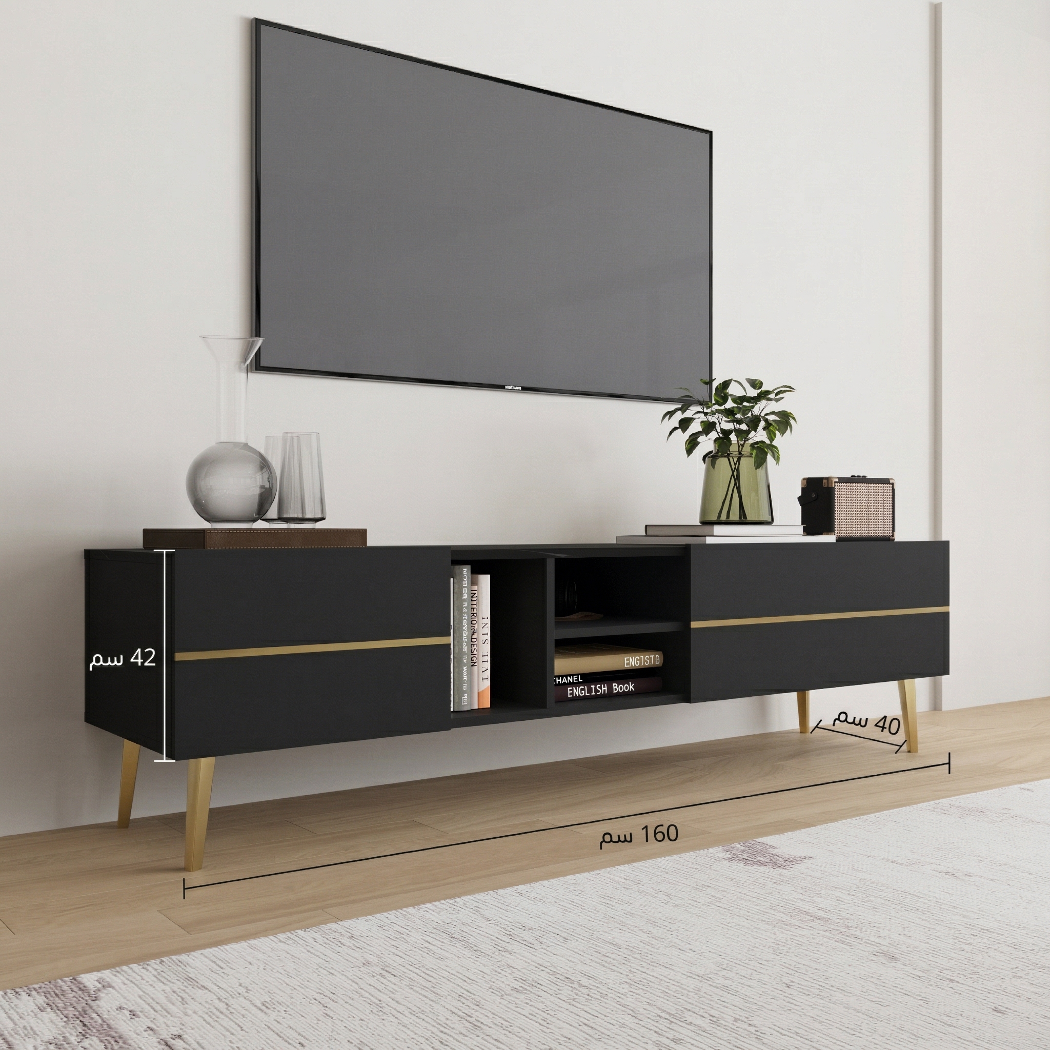 - طاولة التلفزيون: العرض 160 سم | العمق 40 سم | الارتفاع 42 سم.