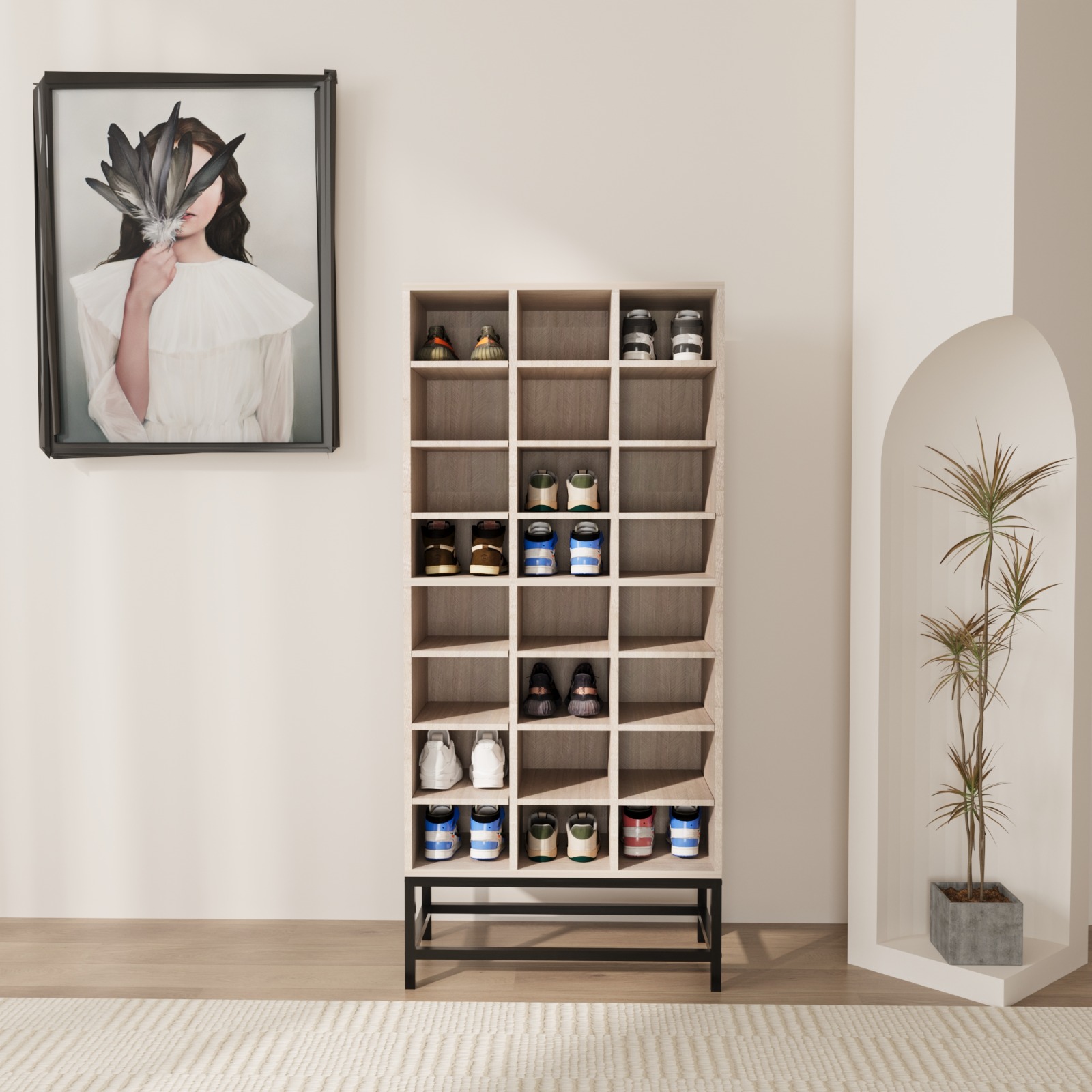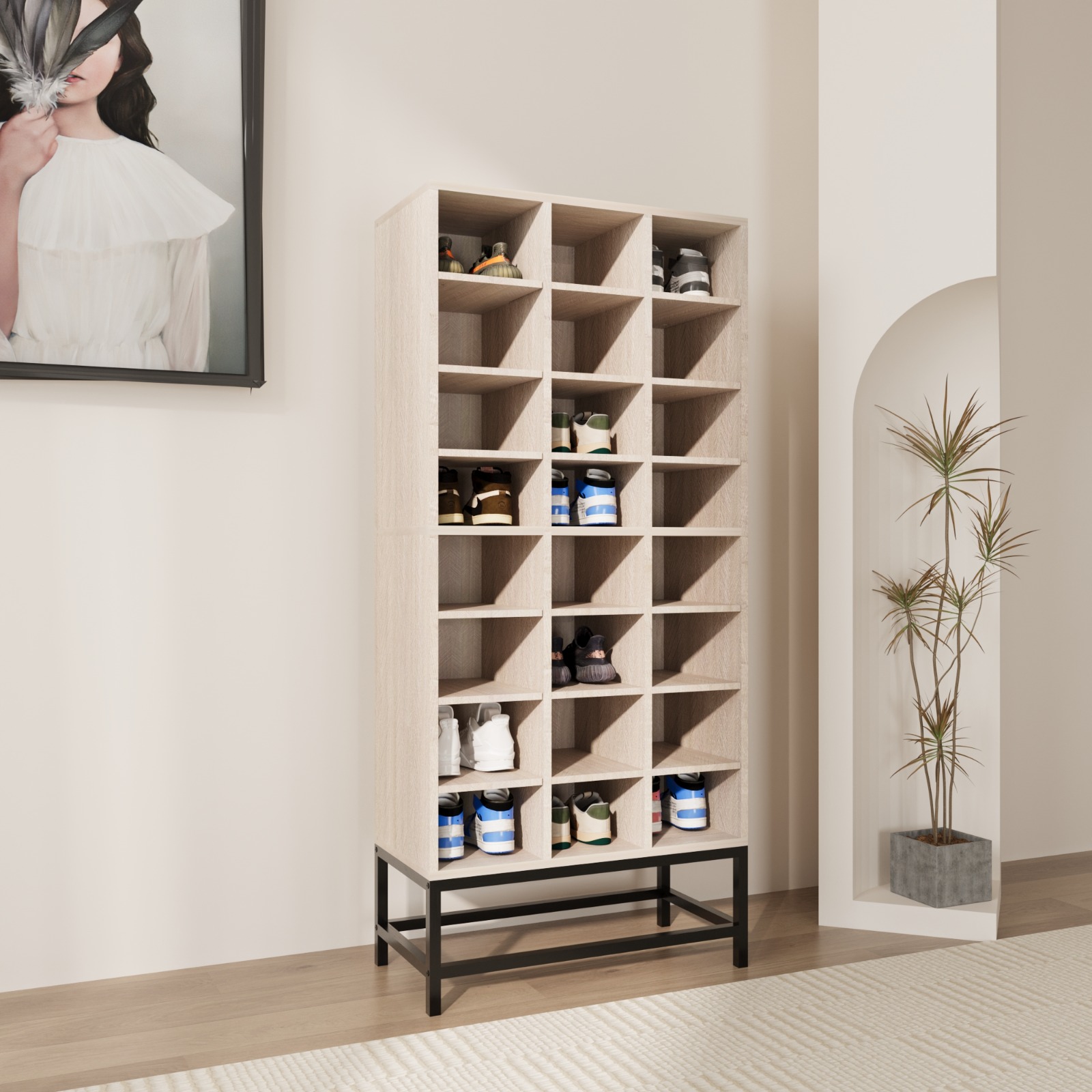 - قاعدة مرتفعة وذكية: مزودة بقاعدة معدنية متينة توفر مساحة إضافية بالأسفل، مثالية لوضع الأحذية اليومية السريعة أو صناديق التخزين.