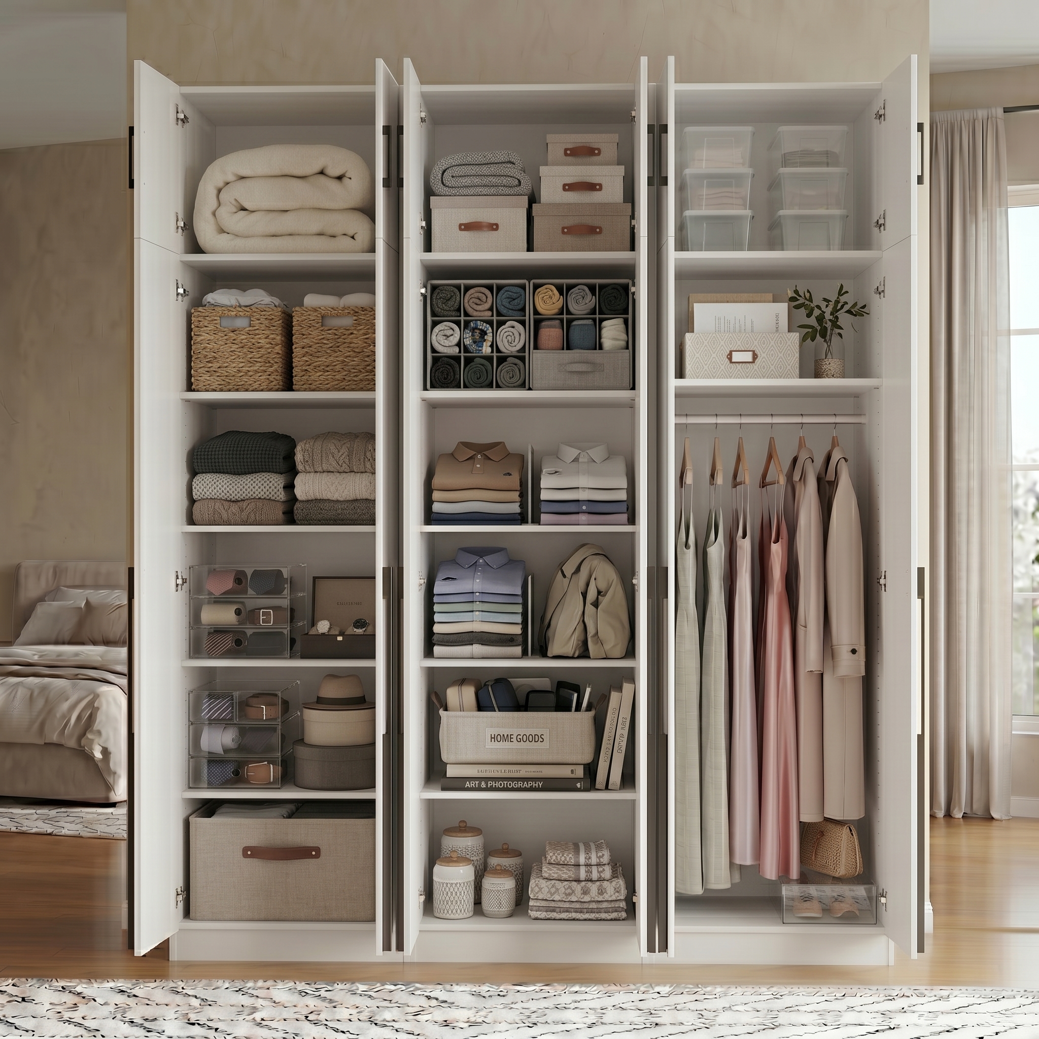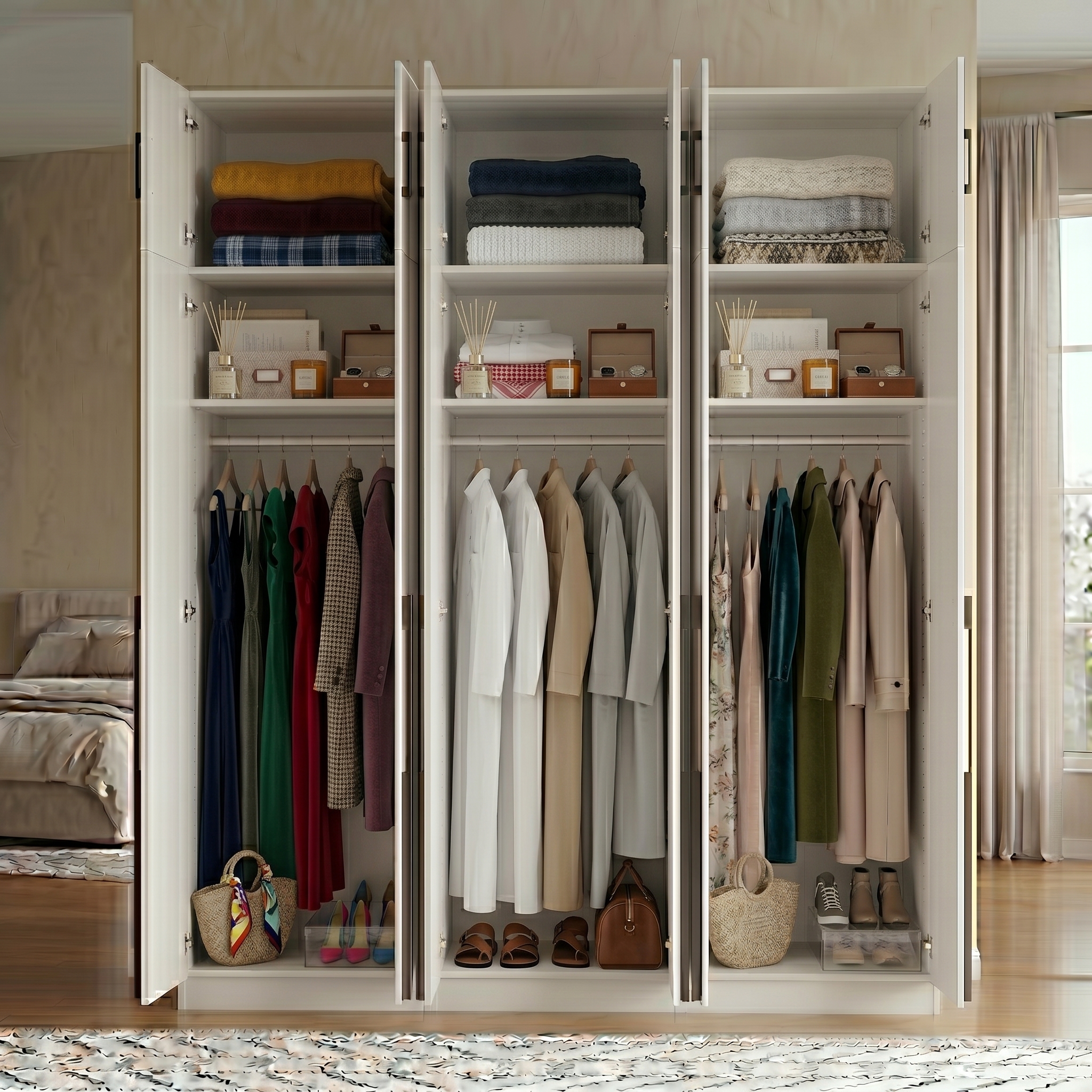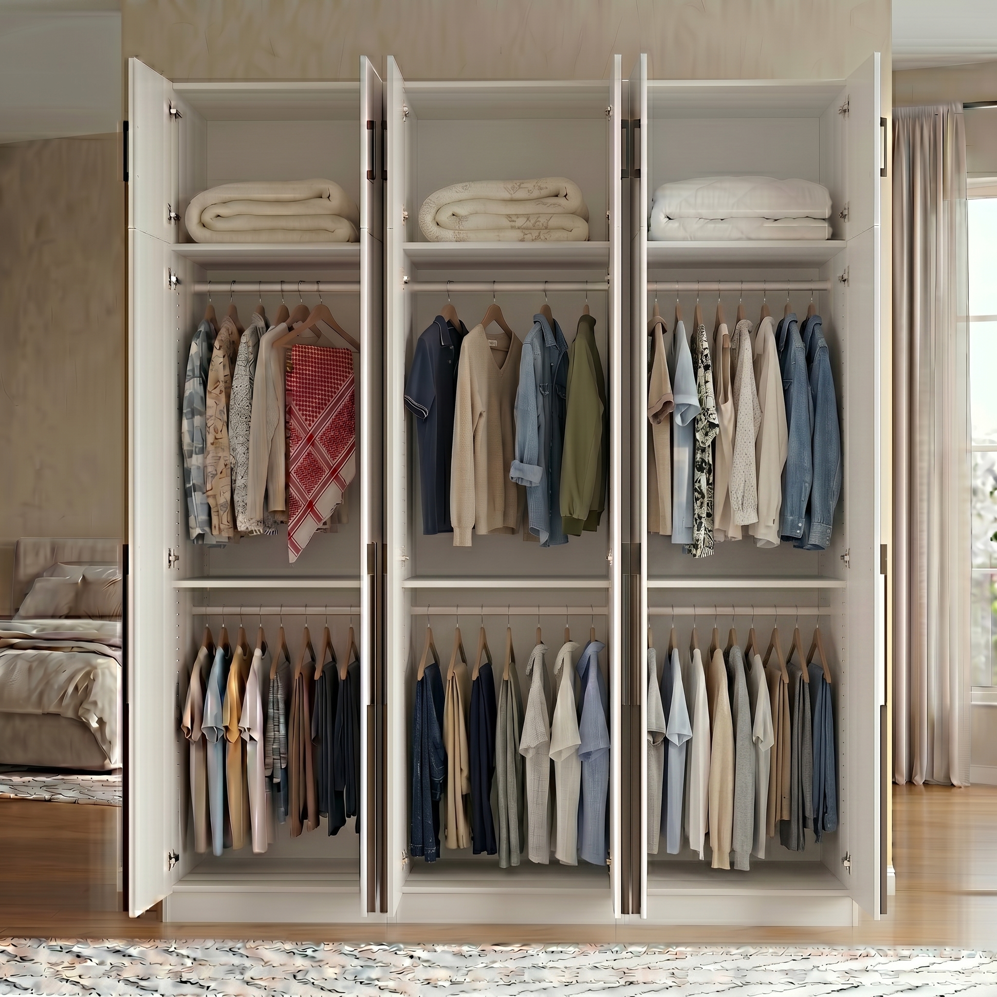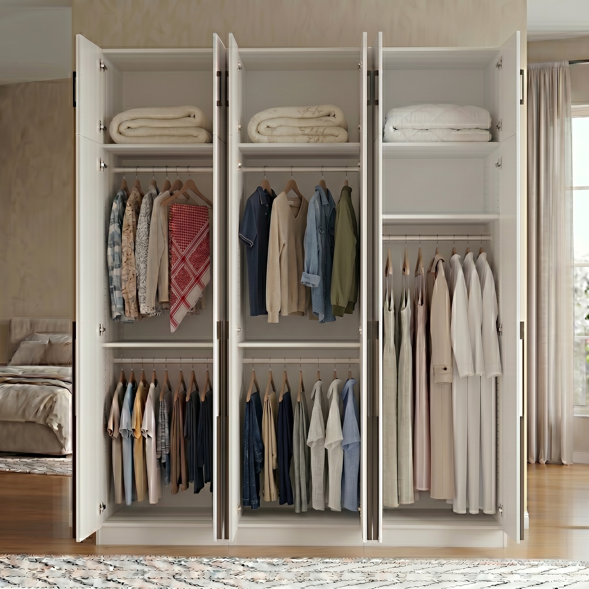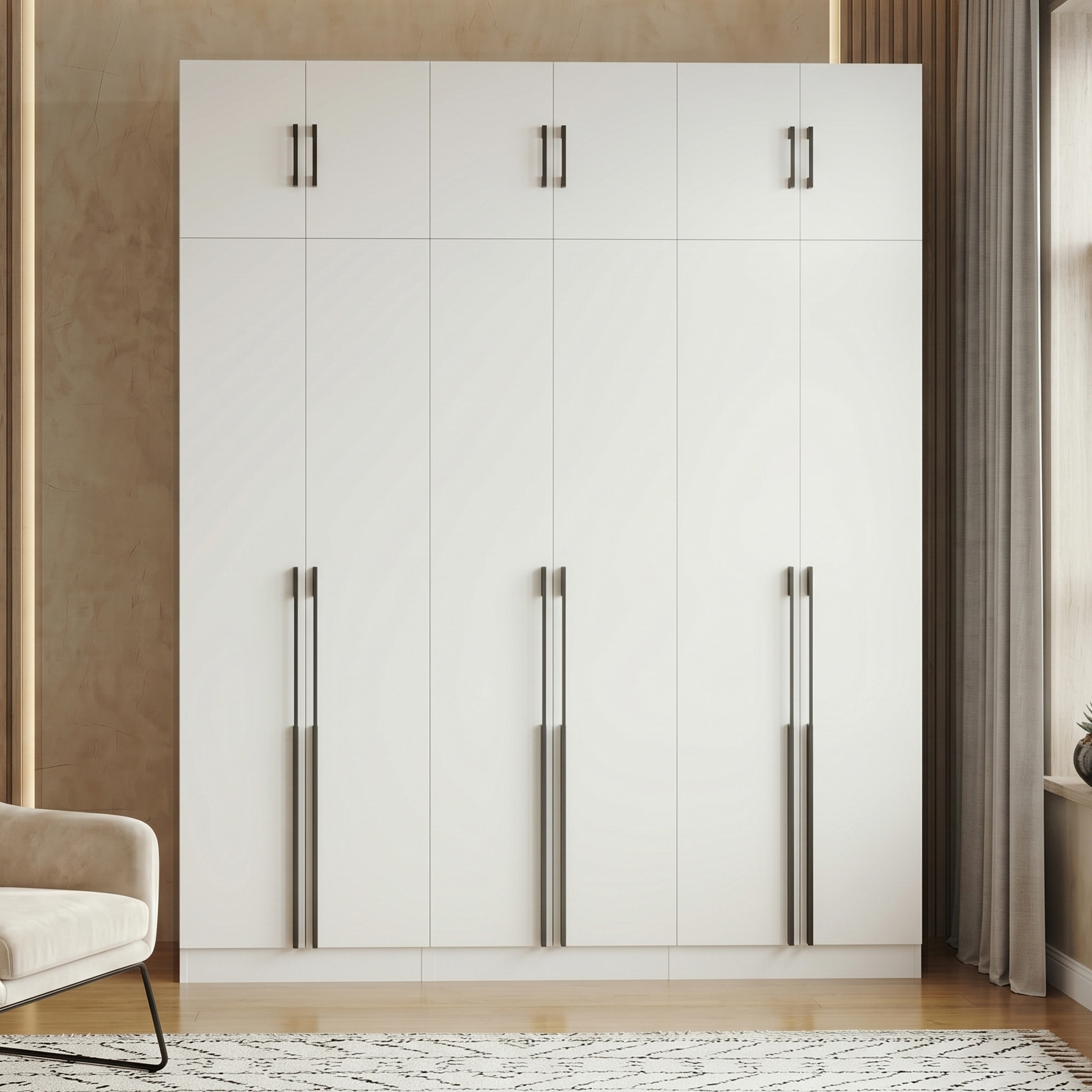 - تصميم تركيبي ذكي (مساحة قابلة للتقسيم): الألواح الفاصلة بين كل بابين هي ألواح مضاعفة! بحيث أن الدولاب ليس مجرد 6 أبواب ملتصقة، بل هو فعلياً 3 دواليب (كل دولاب ببابين) يتم توصيلها بسهولة عن طريق الوصلة المرفقة. هذا يمنحك مرونة أكبر مستقبلاً في حال رغبتك في إضافة المزيد من العرض أو تقسيم الدولاب إلى دولابين أو 3 دواليب منفصلة.